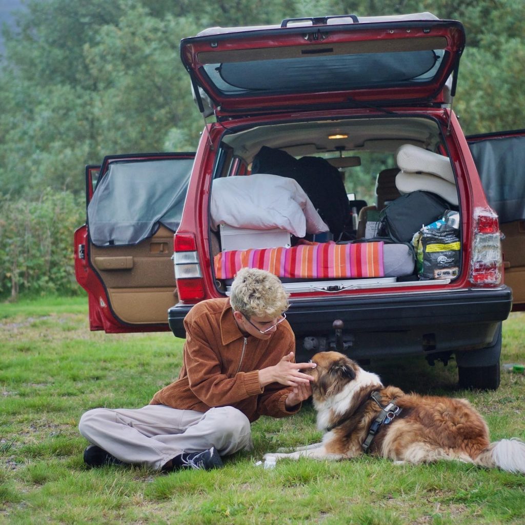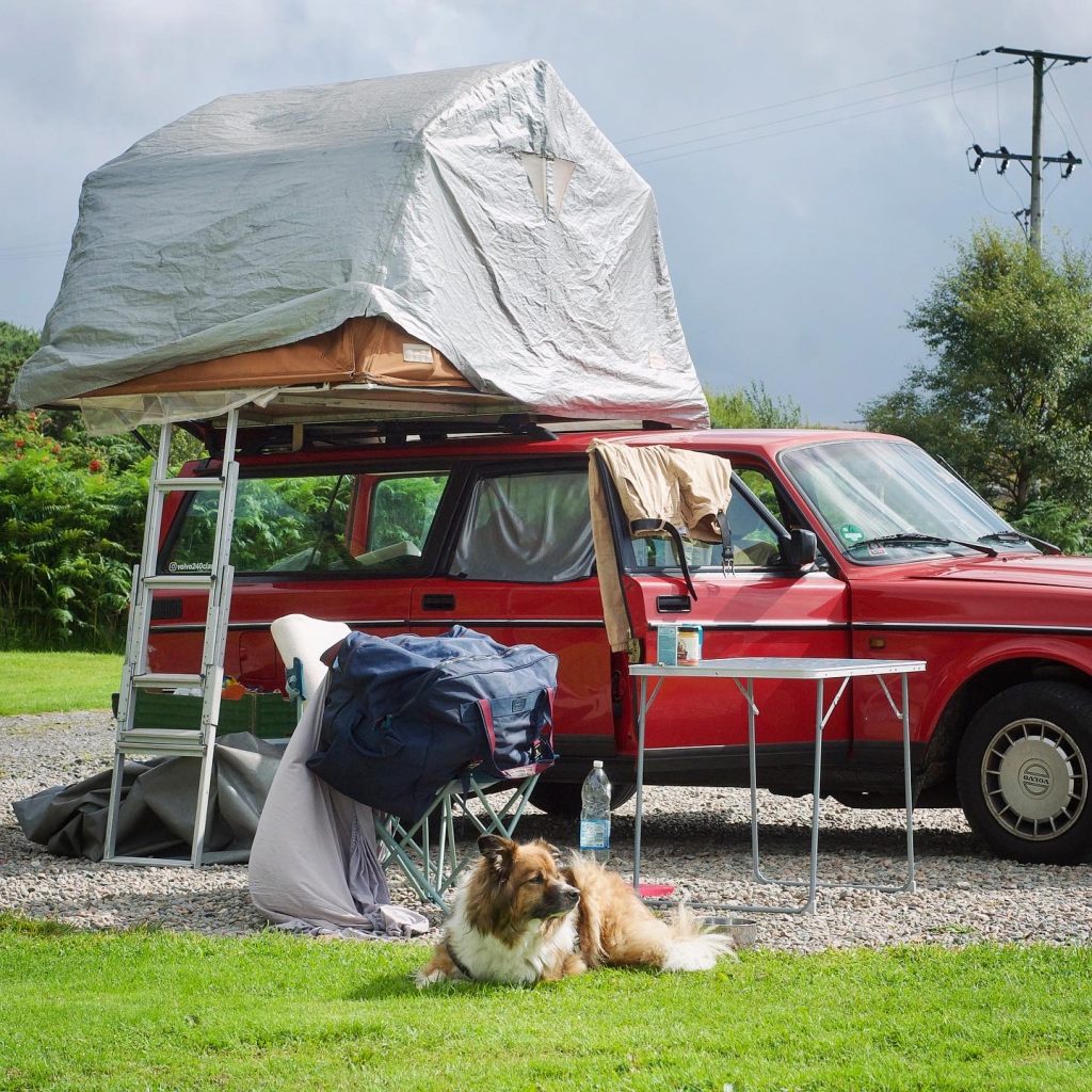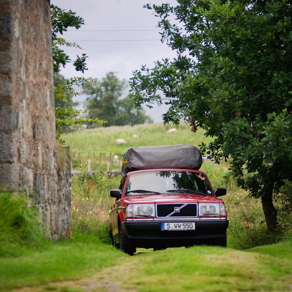 Sometimes you don’t sleep very well in a roof tent. Last night there was a storm and lashing rain in Arisaig and Malte was shaken in the roof tent while Jesse and I in the boot didn’t notice much. Since there was no petrol station nearby, we drove back to Fort William after drying up and had super delicious vegan lunch there at the great The Wildcat in Fort William. Then back to the highlands to Laggan again. Jesse is having trouble with skin irritations, so Malte gave him a good powdering.
